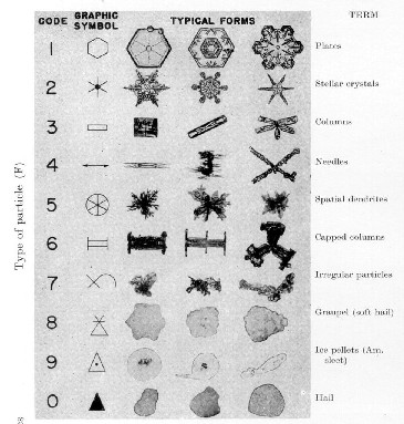 Adoptée en 1952, cette classification recense 7 catégories principales de cristaux de neige, proposées par le japonais Nakaya : plaquettes, étoiles, colonnes aiguilles, dendrites, colonnes à capuchon et cristaux irréguliers. Aux cristaux de neige s'ajoutent trois autres formes de précipitations solides (dans les trois dernières lignes du tableau ci-dessous). On s'imagine le plus souvent que les cristaux de neige sont du type étoile ou plaquette. Pourtant, ces deux types de cristaux ne sont pas plus représentés que les autres.