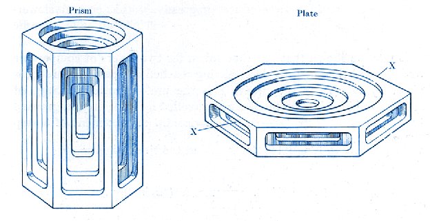 Le prisme hexagonal est la forme la plus simple d'un cristal de glace. Cette forme minimise l'énergie, du fait de l'agencement particulier des molécules d'eau dans la structure cristalline. En particulier les faces planes sont énergétiquement favorables. On note déjà que ces cristaux simples peuvent appartenir à des familles différentes des classifications, selon qu'ils sont plus ou moins allongés sur l'axe c (voir la figure précédente). Un cristal étiré sur l'axe c est plutôt du type colonne, tandis qu'un cristal dont les dimensions sont plus grandes sur les axes a est de la forme plaquette.