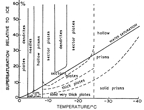 La température et la concentration en vapeur de l'air ont une incidence sur la formes des cristaux. Elles peuvent en effet favoriser un des mécanismes de croissance et donc aboutir à la production d'une forme particulière de cristaux. Le diagramme de phases ci-dessous montre quelles structures sont favorisées pour une température et une saturation de croissance données.