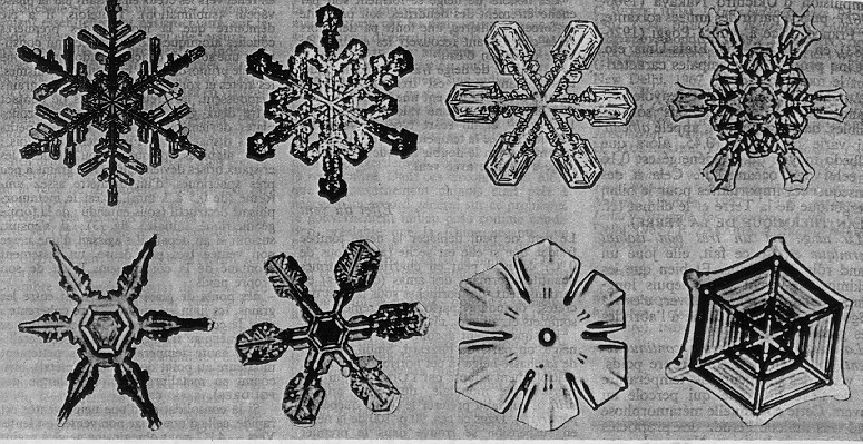 Descartes est le premier, en 1635, à décrire précisément plusieurs formes de cristaux de neige. Il note même quelques formes rares, comme des étoiles à douze branches. Il était sans doute difficile de faire un travail plus complet à l'oeil nu.