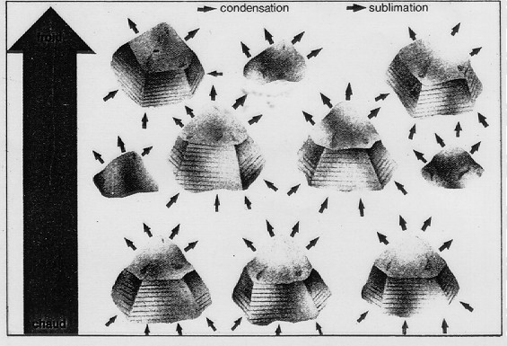 L'évolution de la structure des cristaux de neige est aussi liée à la façon dont les molécules d'eau s'attachent à la surface. Les molécules s'accrochent avec une plus grande efficacité sur les angles d'un cristal. Les arêtes du prisme hexagonal de départ ont donc tendance à se développer plus vite que les faces. On voit alors se former des cristaux prismatiques dont les faces sont creusées.