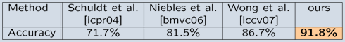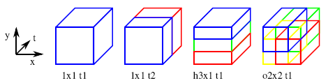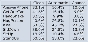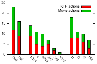are used in many channels. Among the grids, BoF representations are selected most frequently for movie actions. Finer grids such as horizontal 3x1 partitioning and 3-bin temporal grids are frequently selected for the KTH dataset. The observed behavior is consistent with the fact that KTH dataset is more structured in space-time compared to our movie actions dataset.