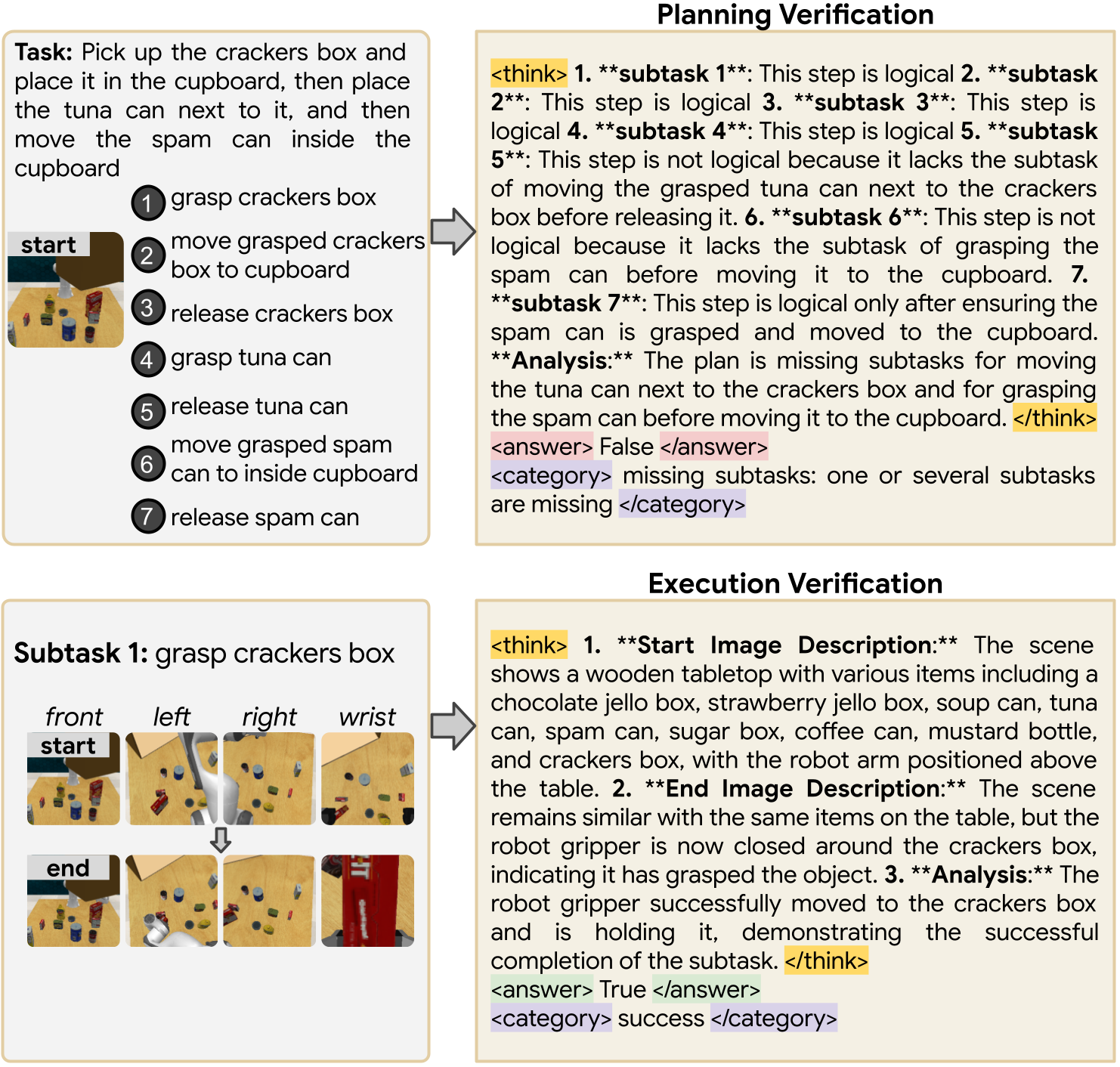 Chain-of-Thought (CoT) Generation. We introduce an automatic method to generate step-by-step CoTs for training reasoning models. For each sample, we first collect the object category, spatial location, and robot state from the RLBench simulator or from ECoT annotations, together with the corresponding failure reason. We then prompt a large reasoning-capable VLM (InternVL3-38B) to generate step-by-step reasoning traces based on the initial text–image inputs and the aforementioned information. For planning samples, the model is instructed to sequentially verify each subtask and subsequently analyze the overall plan. For execution samples, the model is guided to describe the pre- and post-action images before assessing subtask completion. The reasoning trace contains 118 tokens on average.