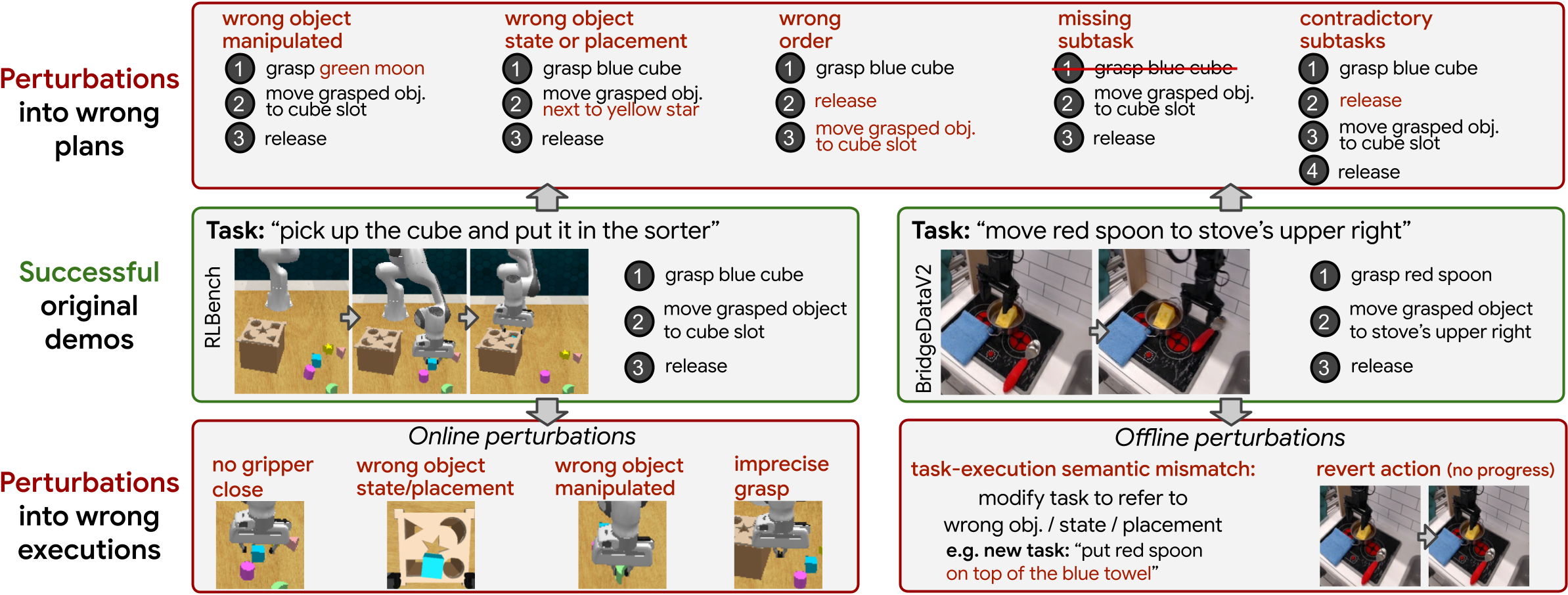 Failure Data Generation Pipeline. We introduce a novel generation pipeline generating failure cases both online in simulation (RLBench), and offline on the real-world dataset (BridgeDataV2). For each positive example, given its correct plan and successful trajectory, we generate a corresponding incorrect plan and unsuccessful trajectory.