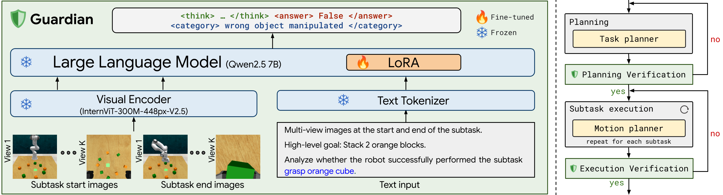 Model Architecture and Integration into a Robotic Manipulation Framework. Left: Overview of the Guardian model architecture. Right: Integration of Guardian model into a robot manipulation pipeline for planning and execution verification.