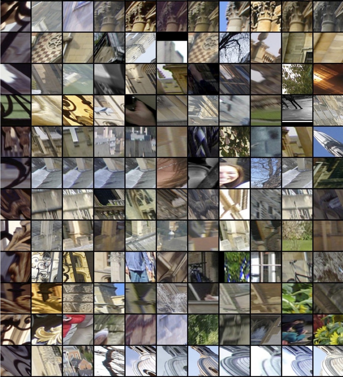 Instead of matching feature descriptors directly as done in Part I and II, descriptors are usually mapped first to discrete symbols, also called visual words, by means of a clustering technique like K-Means. The descriptors that are assigned to the same visual word are considered matched. Each of the rows in the following figure illustrates image patches that are mapped to the same visual word, and are hence indistinguishable by the representation.