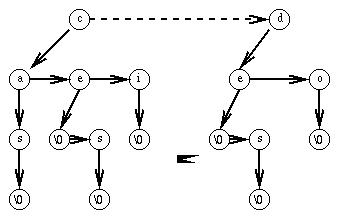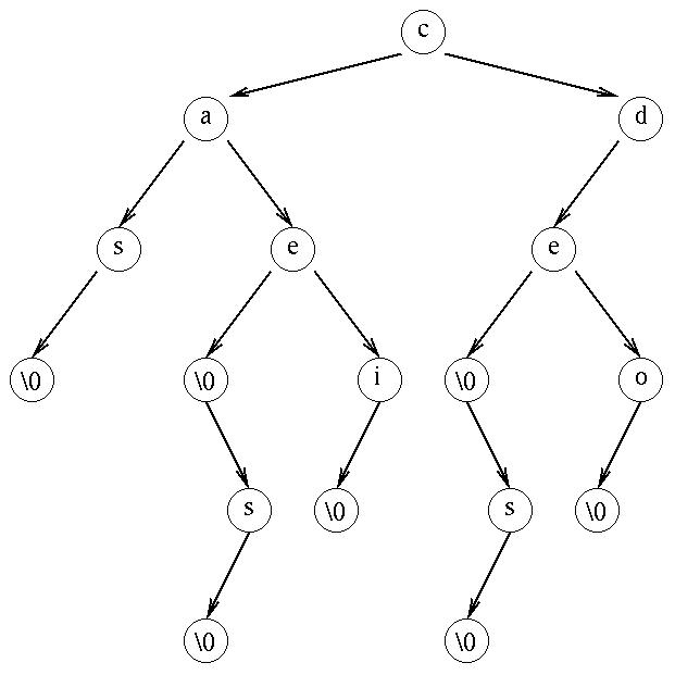 Si le dictionnaire se compose des mots ``cas'', ``ce'', ``ces'', ``ci'', ``de'' ``des'' et ``do'', l'arborescence sera la suivante :